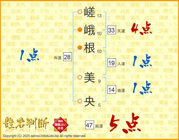 嵯(13画)峨(10画)根(10画) 美(9画)央(5画)
