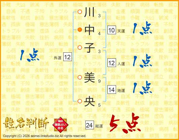 川中子美央さんの総運は24画の5点!