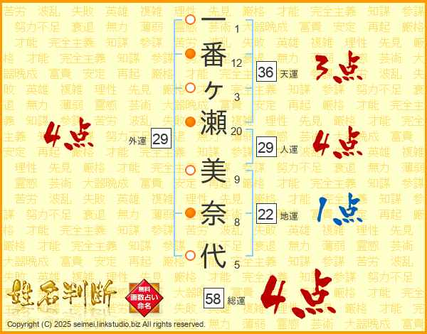 一番ヶ瀬美奈代さんの総運は58画の4点!
