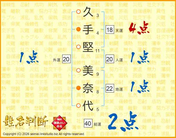 久(3画)手(4画)堅(11画) 美(9画)奈(8画)代(5画)