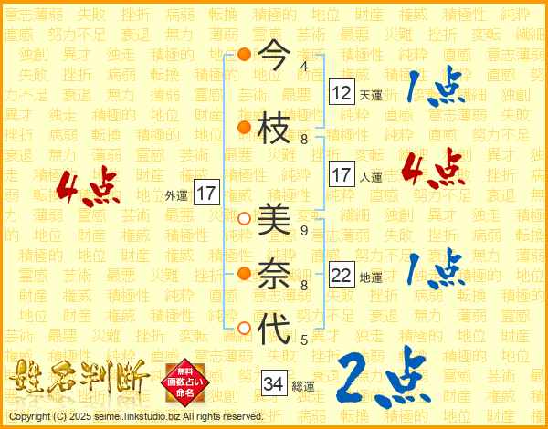 今(4画)枝(8画) 美(9画)奈(8画)代(5画)