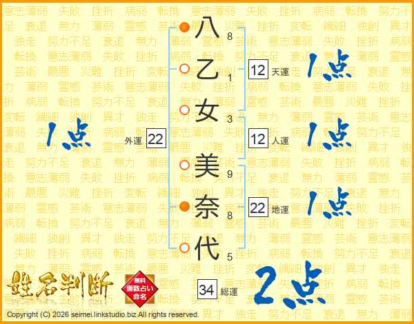 八(8画)乙(1画)女(3画) 美(9画)奈(8画)代(5画)