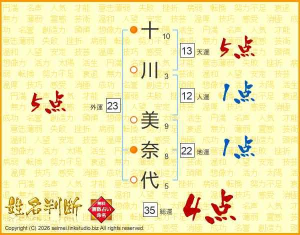 十(10画)川(3画) 美(9画)奈(8画)代(5画)