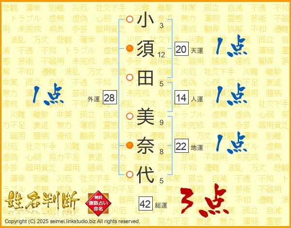 小(3画)須(12画)田(5画) 美(9画)奈(8画)代(5画)