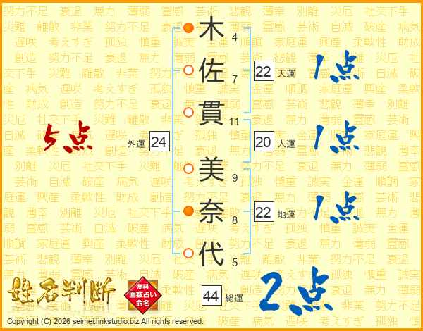 木(4画)佐(7画)貫(11画) 美(9画)奈(8画)代(5画)