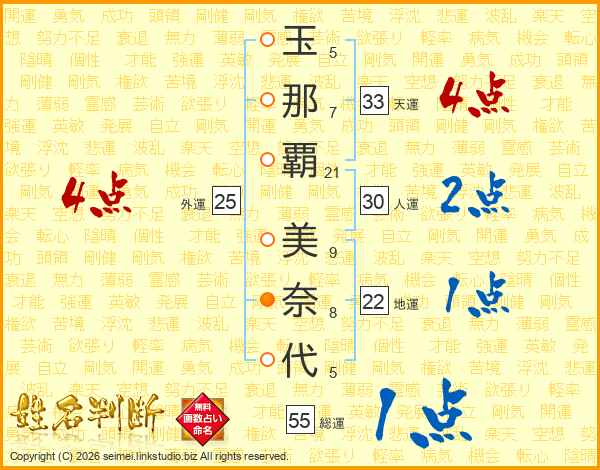 玉(5画)那(7画)覇(21画) 美(9画)奈(8画)代(5画)