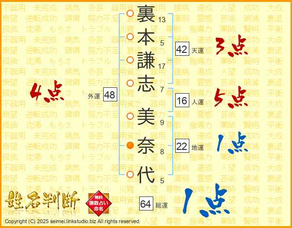 裏(13画)本(5画)謙(17画)志(7画) 美(9画)奈(8画)代(5画)