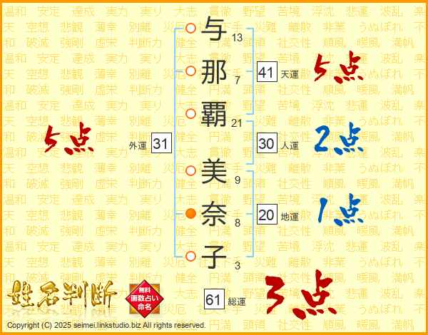 与(13画)那(7画)覇(21画) 美(9画)奈(8画)子(3画)