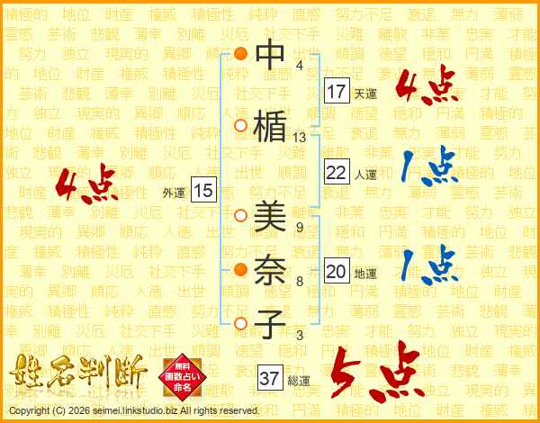 中(4画)楯(13画) 美(9画)奈(8画)子(3画)