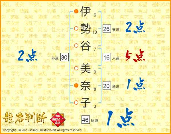伊(6画)勢(13画)谷(7画) 美(9画)奈(8画)子(3画)