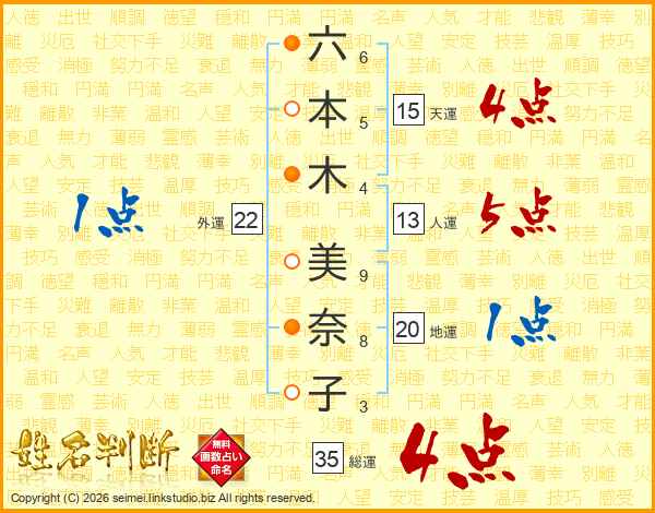六(6画)本(5画)木(4画) 美(9画)奈(8画)子(3画)