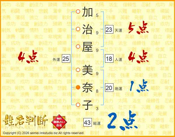 加(5画)治(9画)屋(9画) 美(9画)奈(8画)子(3画)