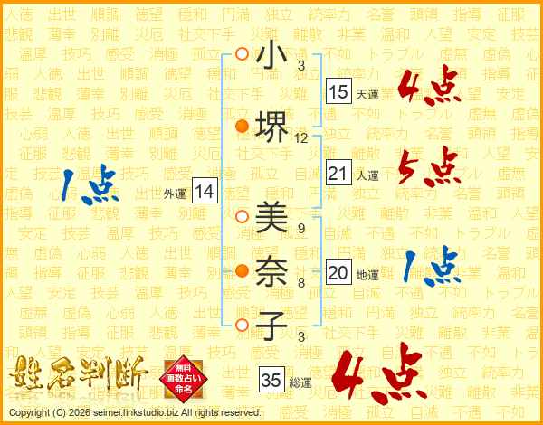 小(3画)堺(12画) 美(9画)奈(8画)子(3画)