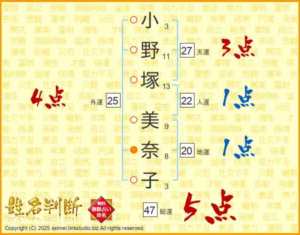 小(3画)野(11画)塚(13画) 美(9画)奈(8画)子(3画)