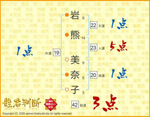 岩(8画)熊(14画) 美(9画)奈(8画)子(3画)