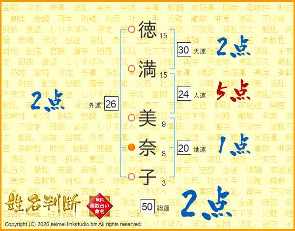 徳(15画)満(15画) 美(9画)奈(8画)子(3画)