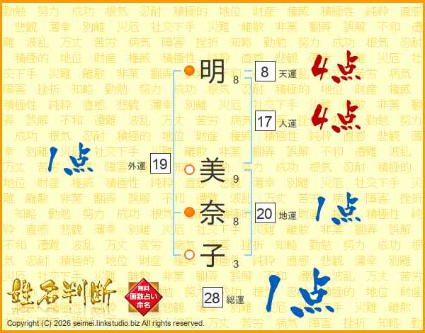 明(8画) 美(9画)奈(8画)子(3画)