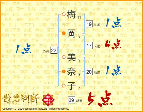 梅(11画)岡(8画) 美(9画)奈(8画)子(3画)