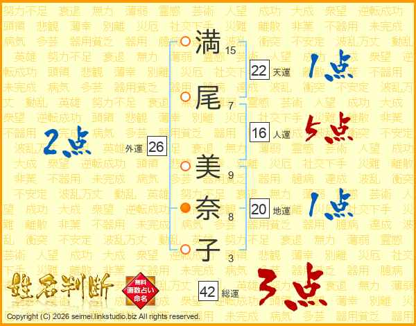 満(15画)尾(7画) 美(9画)奈(8画)子(3画)