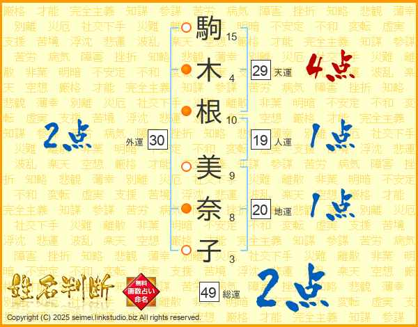 駒(15画)木(4画)根(10画)  美(9画)奈(8画)子(3画)
