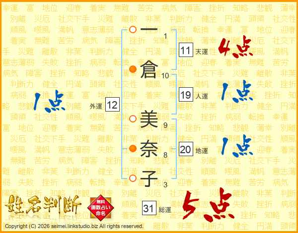 一(1画)倉(10画) 美(9画)奈(8画)子(3画)