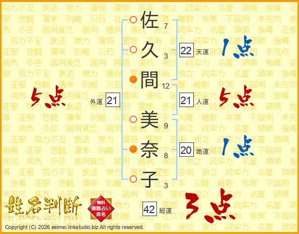 佐(7画)久(3画)間(12画) 美(9画)奈(8画)子(3画)