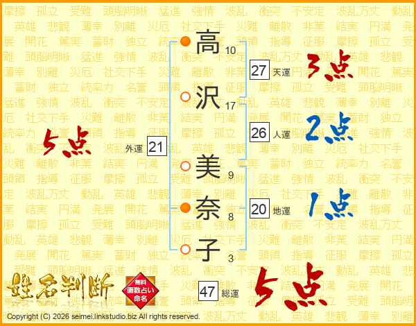 高(10画)沢(17画) 美(9画)奈(8画)子(3画)