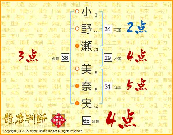 小(3画)野(11画)瀬(20画) 美(9画)奈(8画)実(14画)