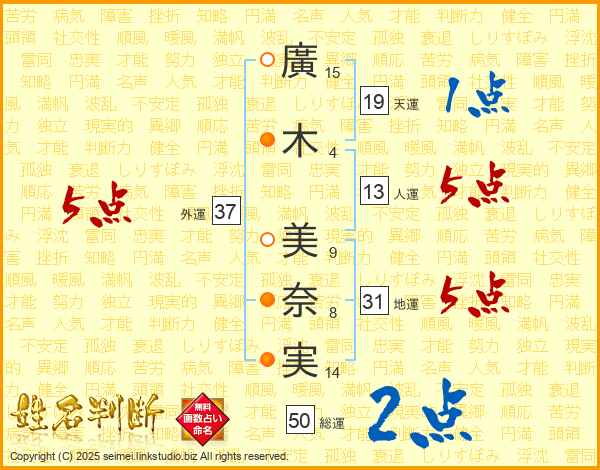 廣(15画)木(4画) 美(9画)奈(8画)実(14画)