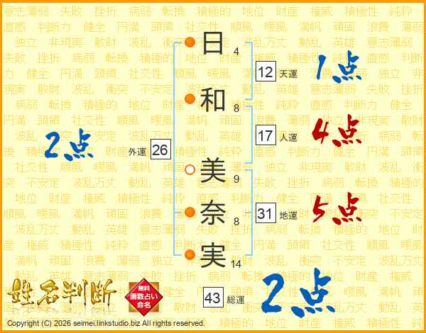 日(4画)和(8画) 美(9画)奈(8画)実(14画)