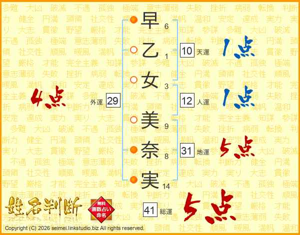 早乙女美奈実さんの総運は41画の5点!