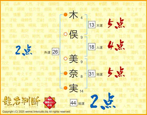 木(4画)俣(9画) 美(9画)奈(8画)実(14画)