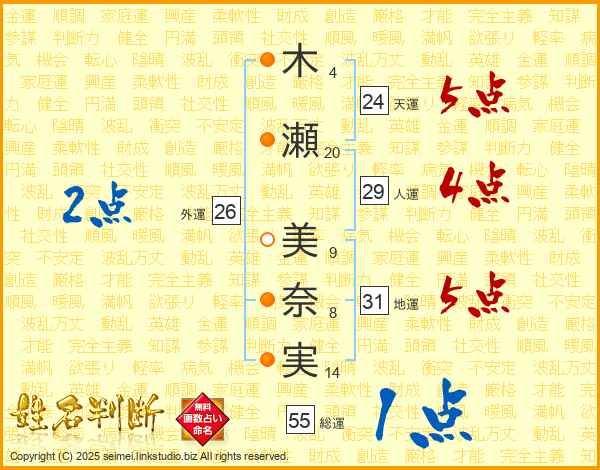 木(4画)瀬(20画) 美(9画)奈(8画)実(14画)