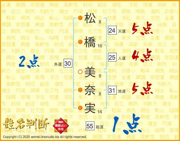 松(8画)橋(16画) 美(9画)奈(8画)実(14画)