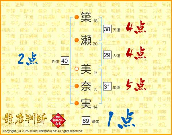 簗(18画)瀬(20画) 美(9画)奈(8画)実(14画)