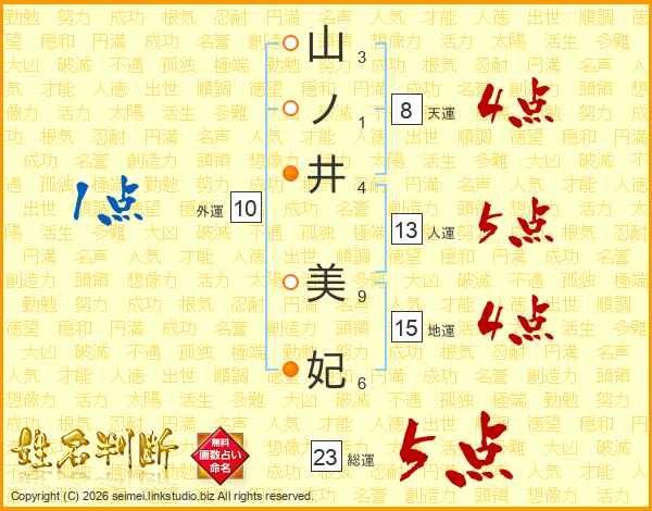 山(3画)ノ(1画)井(4画) 美(9画)妃(6画)