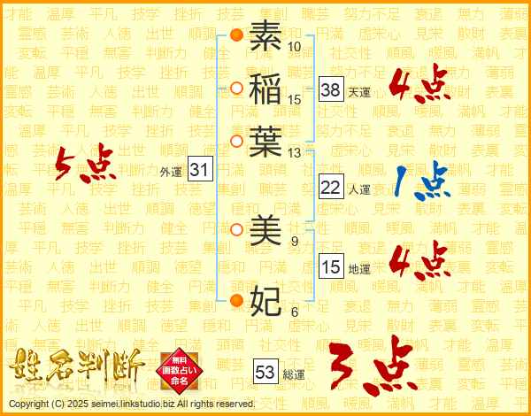 素(10画)稲(15画)葉(13画) 美(9画)妃(6画)