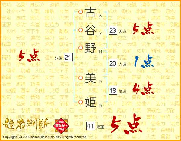 古(5画)谷(7画)野(11画) 美(9画)姫(9画)