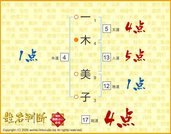 生活面を象徴する運勢です。外部から受ける影響力を表し、結婚運、家庭運や職場、環境への順応性を表します。総運から人運を引いた画数。姓や名が1文字の場合を除く。