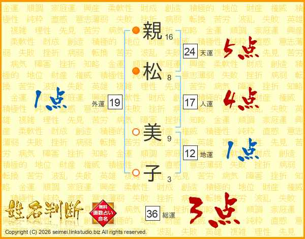 親(16画)松(8画) 美(9画)子(3画)