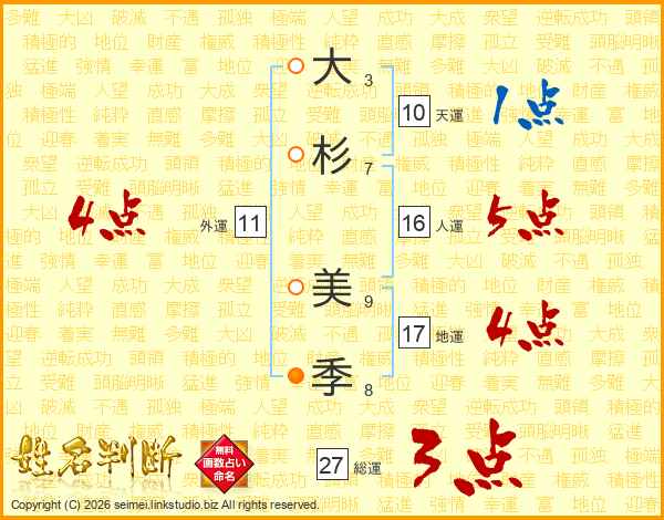 大(3画)杉(7画) 美(9画)季(8画)