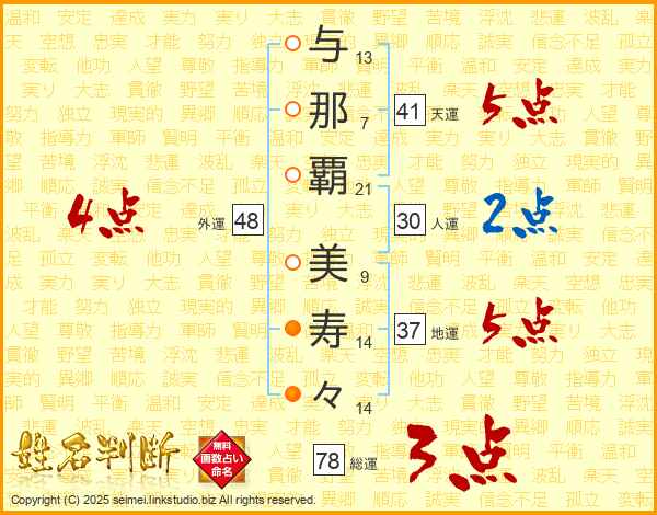 与(13画)那(7画)覇(21画) 美(9画)寿(14画)々(14画)