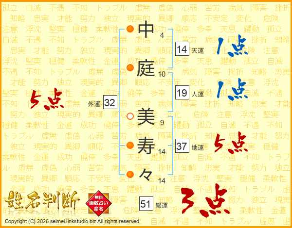 中(4画)庭(10画) 美(9画)寿(14画)々(14画)