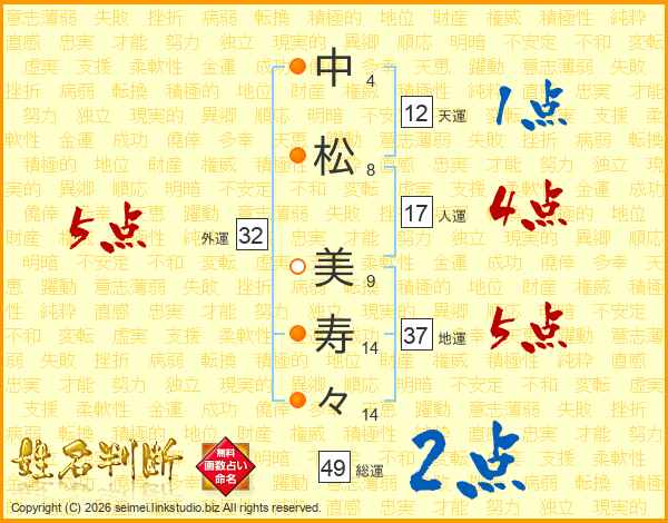 中(4画)松(8画) 美(9画)寿(14画)々(14画)