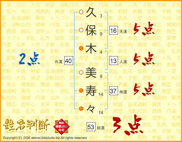久(3画)保(9画)木(4画) 美(9画)寿(14画)々(14画)
