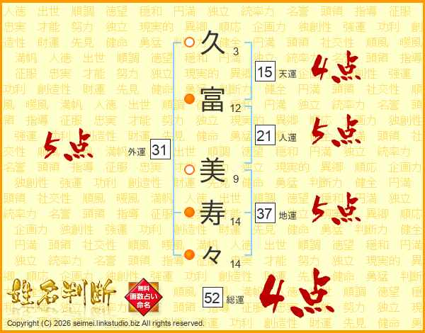 久(3画)富(12画) 美(9画)寿(14画)々(14画)
