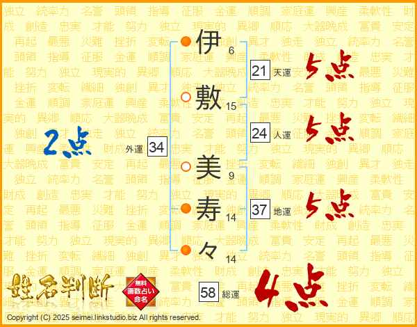 伊(6画)敷(15画) 美(9画)寿(14画)々(14画)