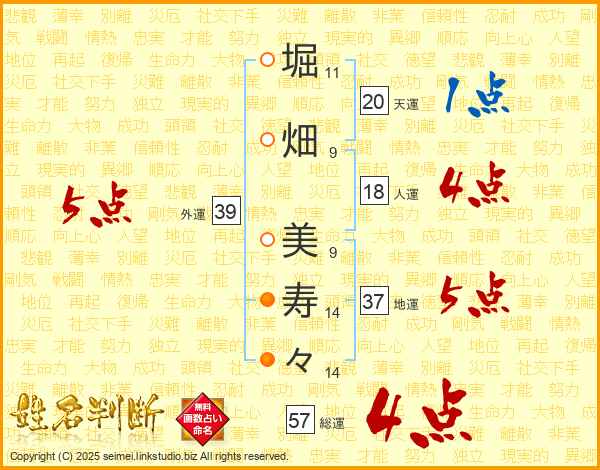 堀(11画)畑(9画) 美(9画)寿(14画)々(14画)