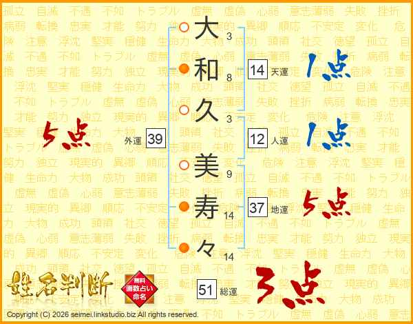 大(3画)和(8画)久(3画) 美(9画)寿(14画)々(14画)