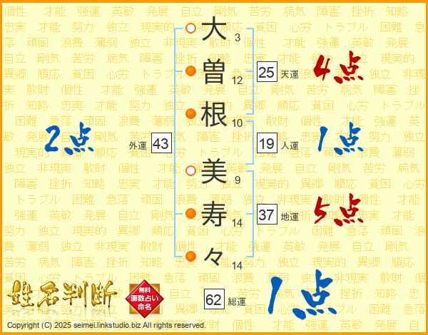 大(3画)曽(12画)根(10画) 美(9画)寿(14画)々(14画)